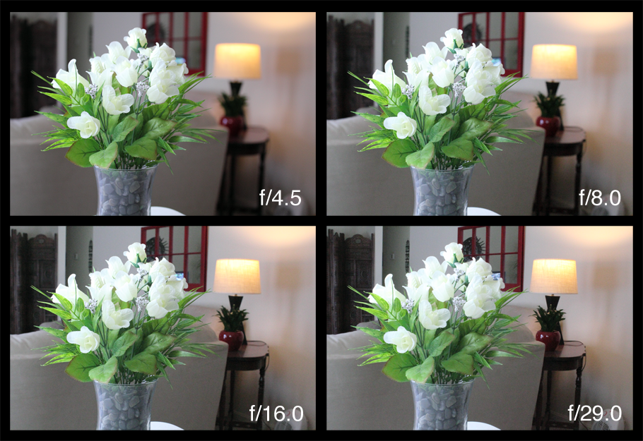 For these photographs, I set my camera to Aperture Priority, Av on my Canon t2i (550D). As I increased the f/stop, the Depth of Field or Depth of Focus (DoF) increased – background objects became more and more in focus. This is great if you want to have objects at different distances stay in focus, but it's distracting when you want to highlight the main subject. A lower f/stop blurs the background, forcing your eye to look at the main subject, which is the flowers. This effect is very helpful for any scene with a crowded background (or foreground), and is essential for portraits.