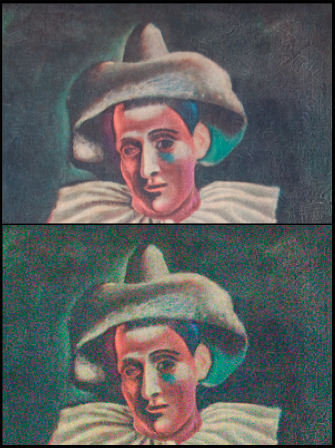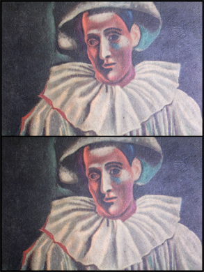 Here are two photographs of a reproduction Picasso painting that's been in my family since I was a kid. The two shots were taken in full Manual Mode with ISO 1600, and White Balance set manually to Fluorescent (this last bit isn't strictly necessary, but I didn't want anything to change in these photographs except Aperture and Shutter Speed).