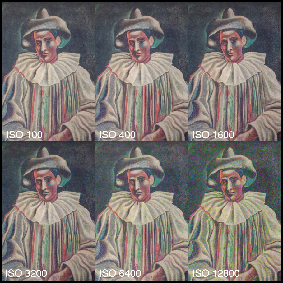 These next two images show a zoomed region of the ISO 100 and ISO 12800 photographs. The increase in noise and annoying color cast are apparent. Such higher noise could really degrade an enlargement, even though there are plenty of pixels (and thus spatial resolution) in the image.