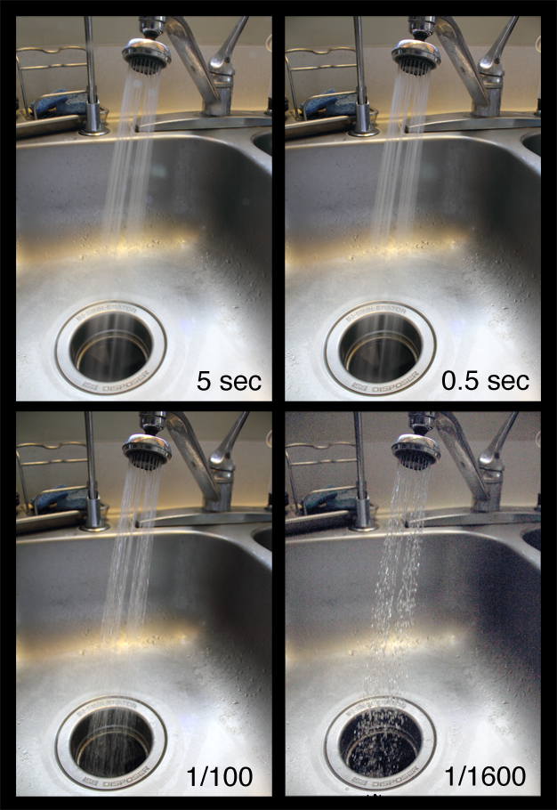I ran water in the kitchen sink, and photographed the scene with different shutter speeds. My camera was set to Shutter Priority, Tv on my Canon t2i.